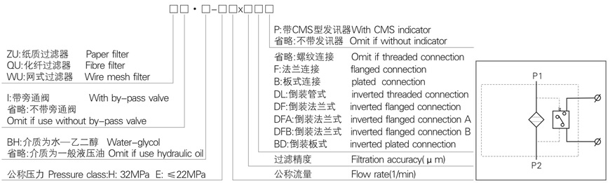 注:*為過濾精度,#為過濾材料,若使用介質為水—乙二醇,濾材為紙質,帶發訊器和旁通閥,則過濾器型號為:ZUI·BH—H63×*P,濾芯型號為HX·BH-63×*濾材為化纖,帶發訊器,則過濾器型號為:QU·BH-63×*P, 濾芯型號為:HX·BH-63×*Q,濾材為金屬網,帶發訊器,則過濾型號為:WU-H63×*P,濾芯型號為:HX-63×*W