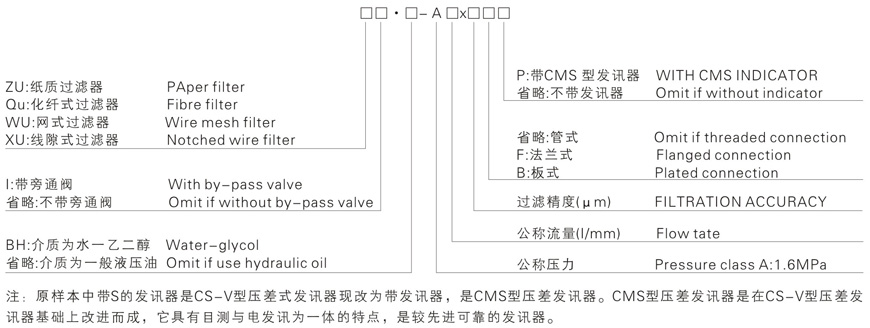 注:*為過濾精度,若使用介質(zhì)為水一乙二醇,帶發(fā)訊器,過濾器型號為:XU·BH-A63×*P,濾芯型號為TXX·BH-63×*。
