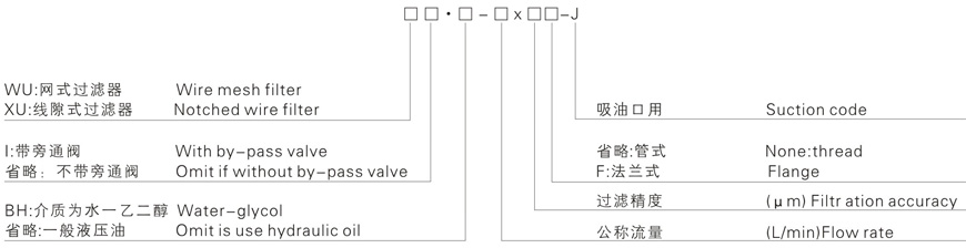 注:*為過濾精度,若使用介質為水一乙二醇。帶旁通閥。公稱流量100L/min,過濾精度80μm,帶則過濾器型號為:WUI·BH-100×*-J